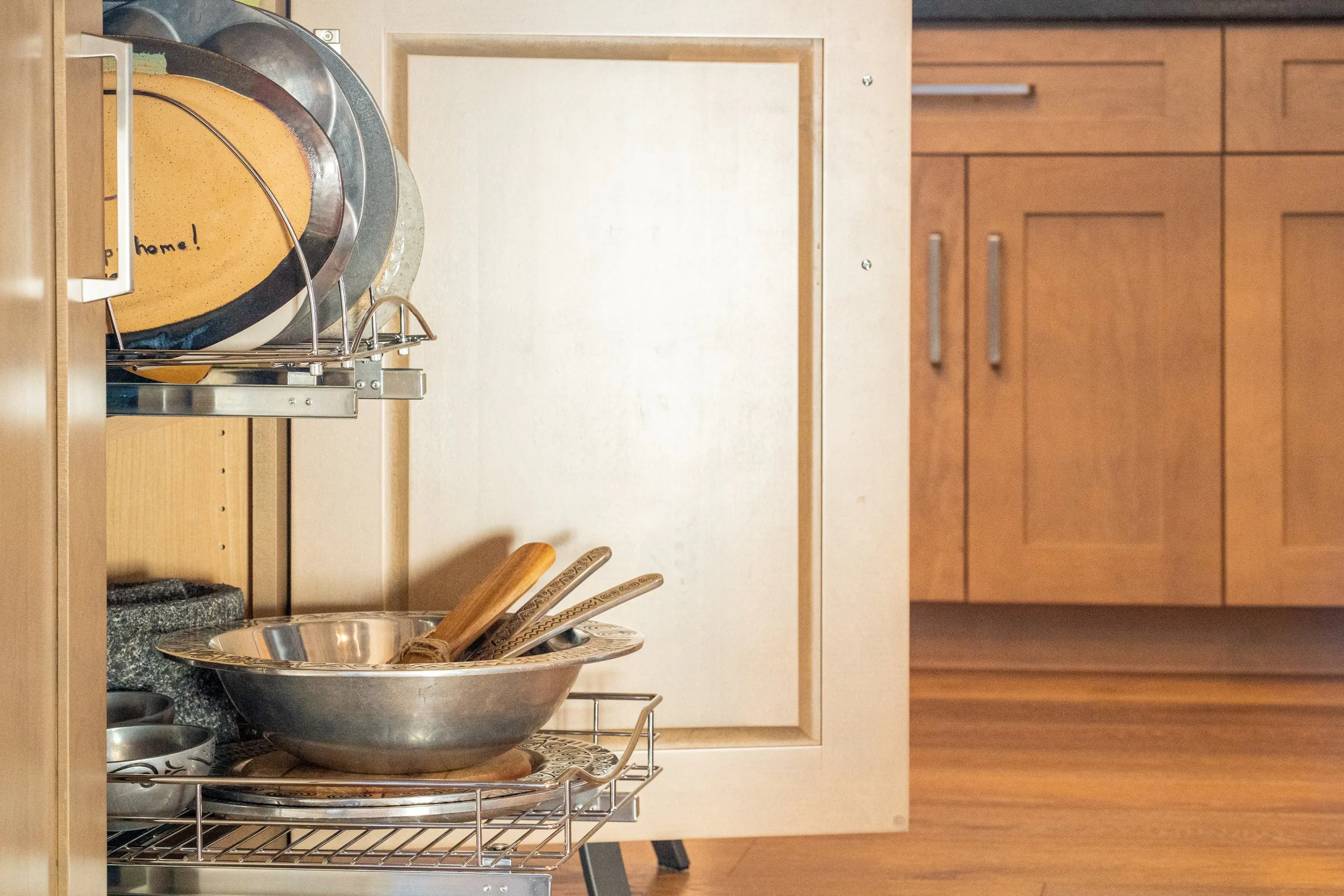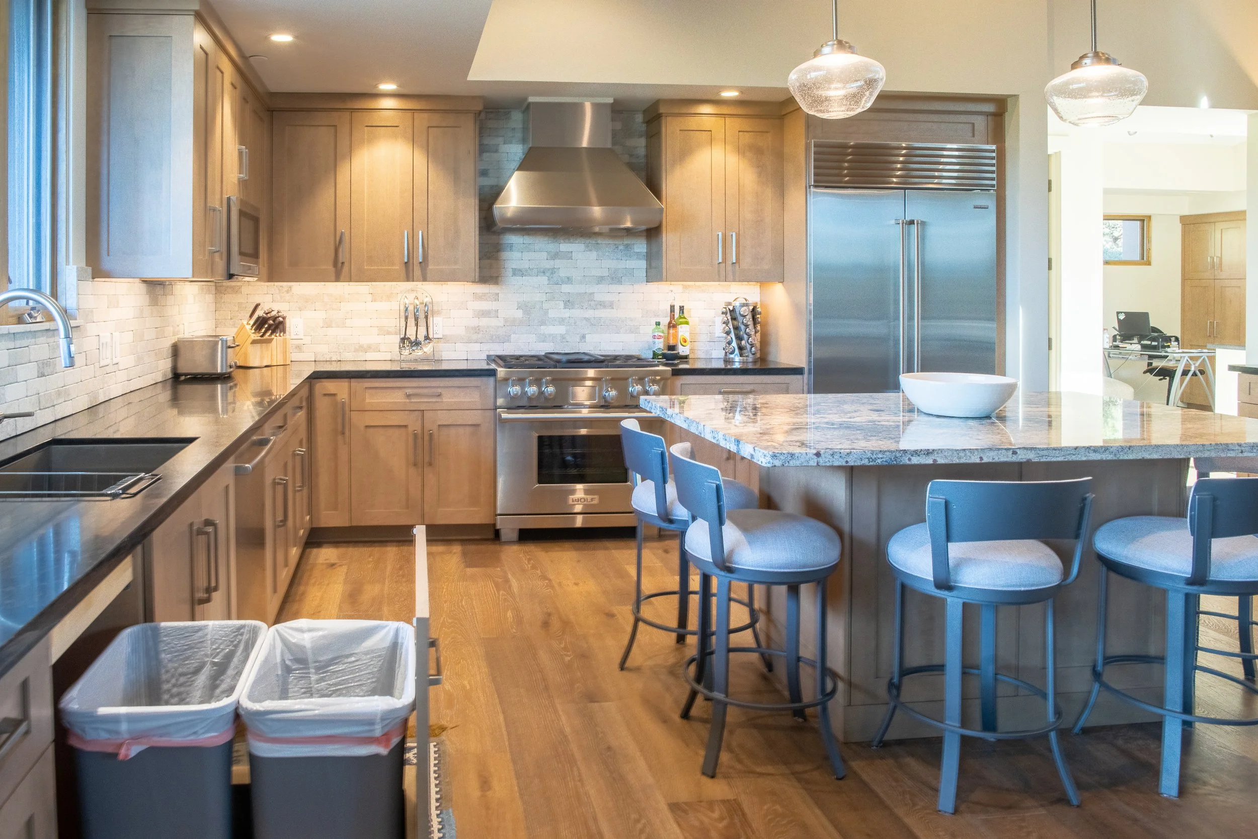 This southwest contemporary home is an Eric Brandt masterpiece. These cabinets feature a classic wide rail shaker door style in maple with a fresh taupe stain. Clever storage solutions found throughout the kitchen combined with ample counter space make it a cooks dream.
